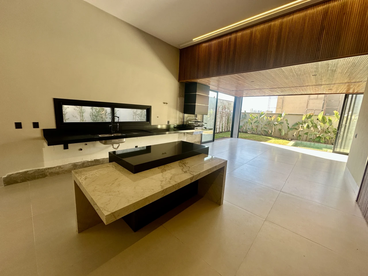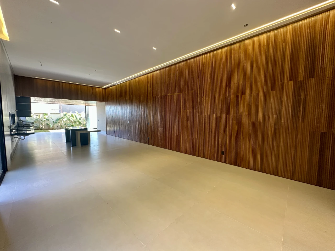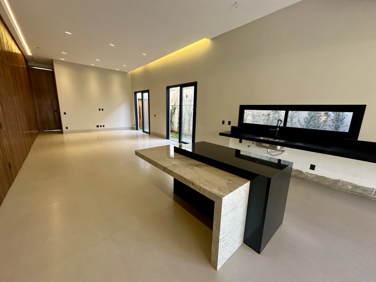 Sala, jantar e cozinha com pé direito elevado, integração total com a sala de estar, de jantar e cozinha, possui lavabo e despensa