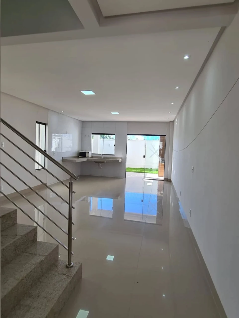 Sala ampla integrada à área gourmet com churrasqueira - Quintal gramado para momentos que viram memória - Energia solar, iluminação 100% LED