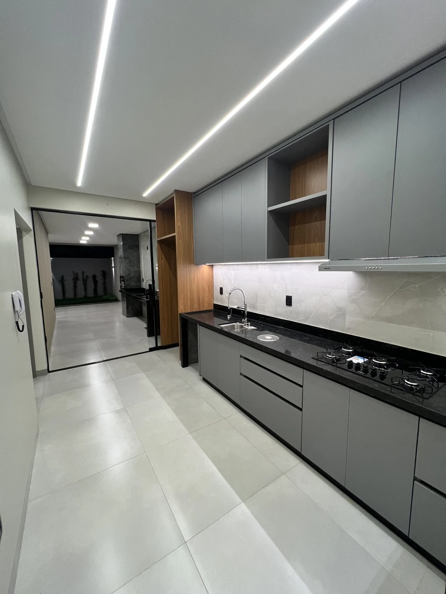Projeto de iluminação moderno, acabamento premium, armários na cozinha